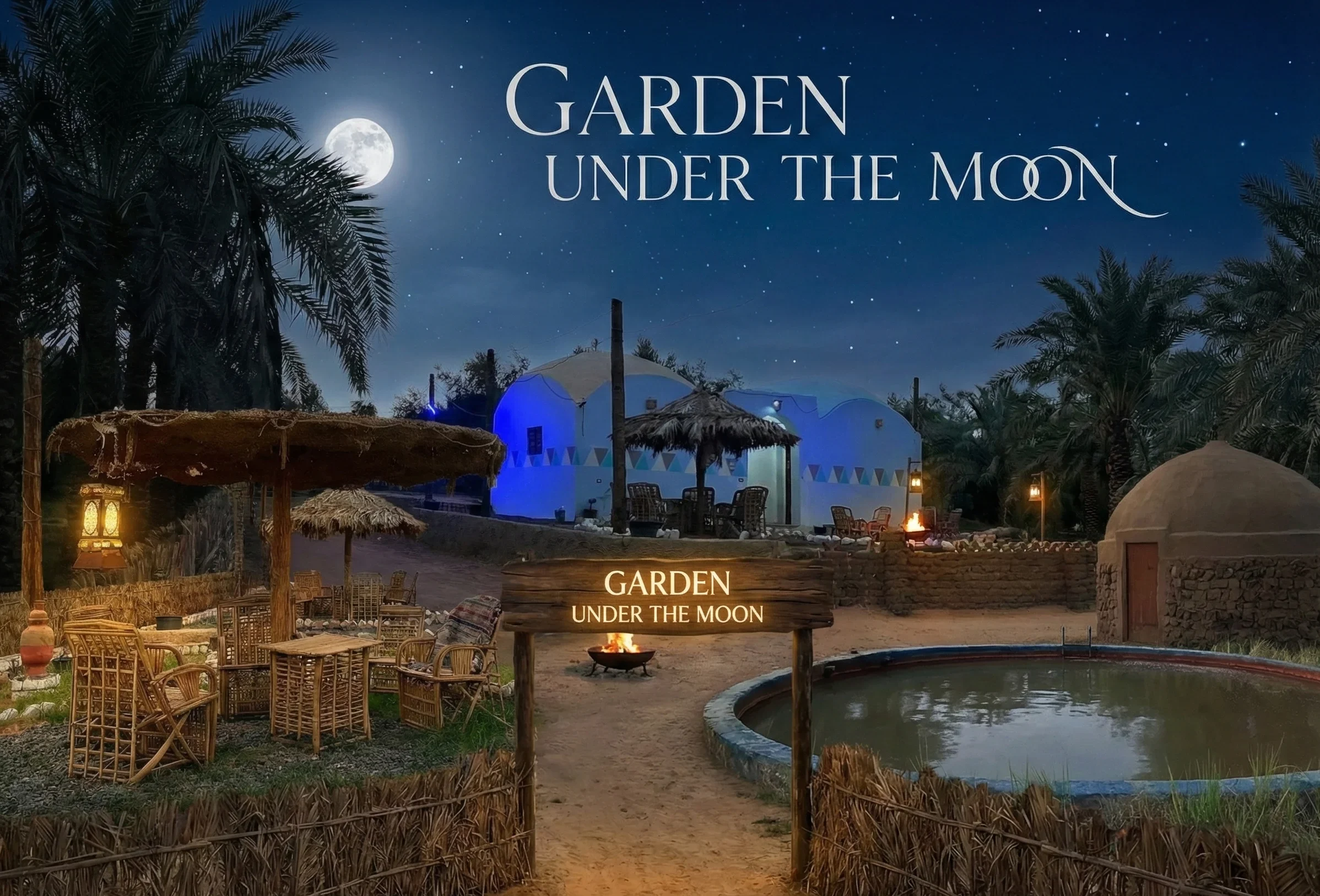Garden Under the Moon sits at the base of a Black Desert mountain — a unique location where volcanic landscapes meet a quiet palm garden.